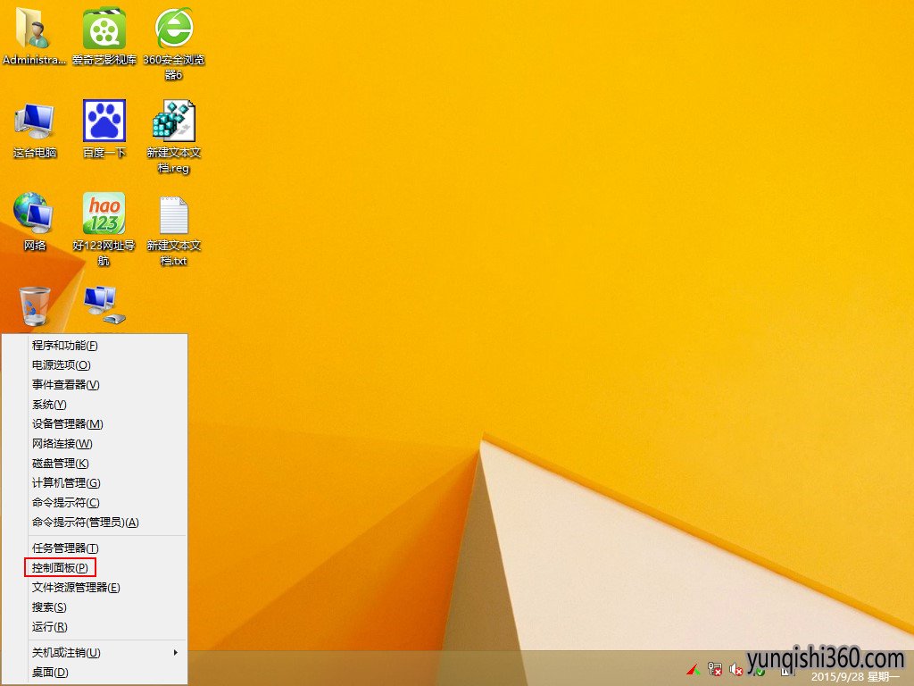 1、在桌面上使用win+x快捷键打开菜单,选择“控制面板”,如下图所示: