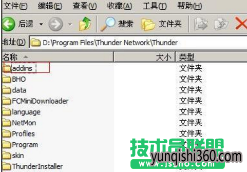 2、进入迅雷安装目录,找到addins文件夹,进入去。