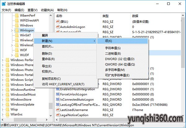 2、定位到:HKEY_LOCAL_MACHINE\SOFTWARE\Microsoft\Windows NT\CurrentVersion\Winlogon,在Winlogon单击右键新建“项”,命名为SpecialAccounts;