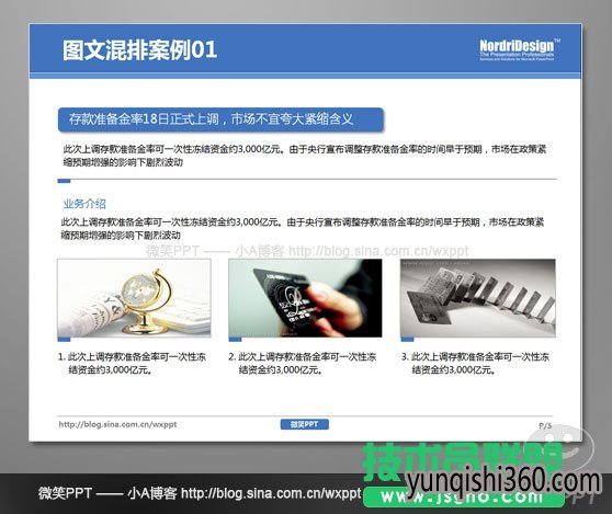 页面保留了商务ppt的特性,规规矩矩。3张图分别对应图上3条内容信息。但PPT排版的问题,使得图片与内容缺乏呼应,页面大有“为了放图而放图”的感觉,缺乏指向性。